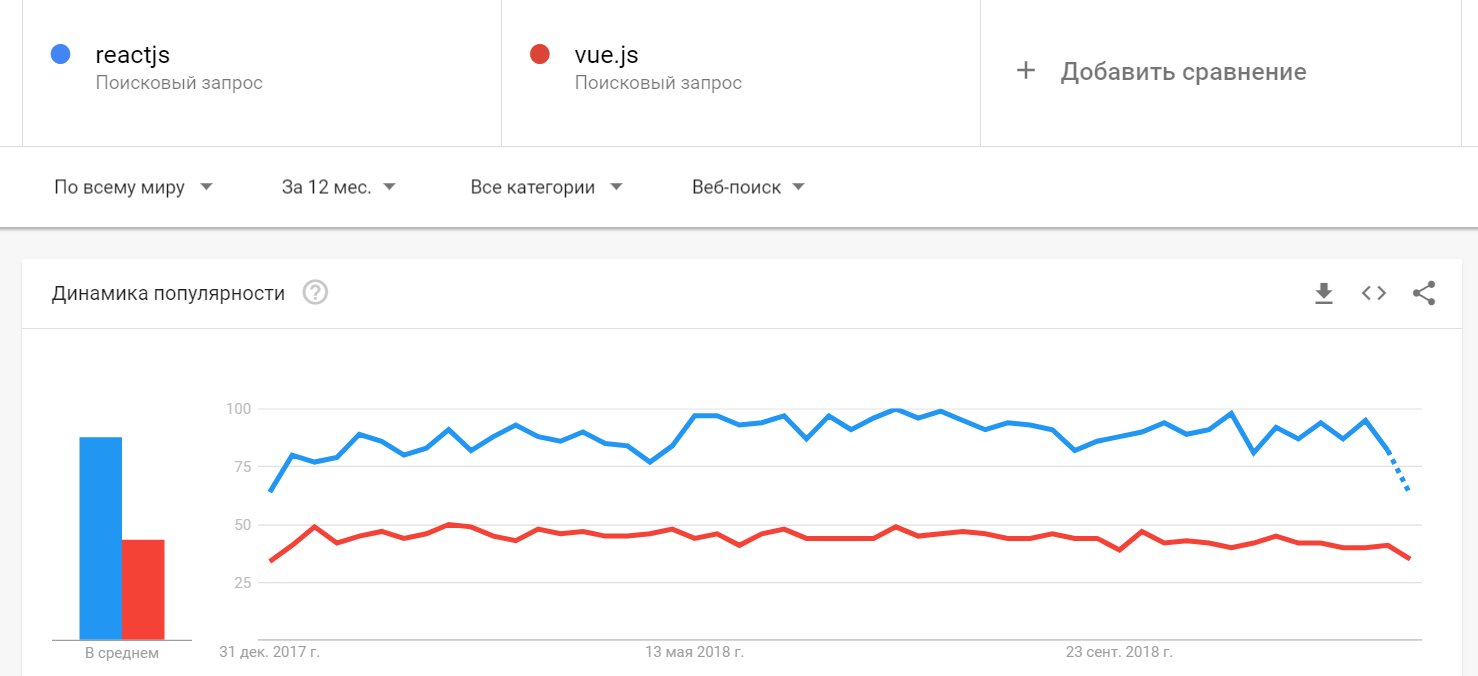 Bu il biz həm də React və Vue.js-un dirəşməsini gördük. Google Trends deyir ki, Reactjs-i daha çox axtarıblar nəinki vuejs: