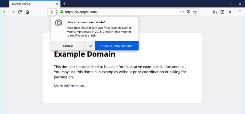 Firefox brauzerinin Desktop versiyası hacker hücumlarına məruz qalmış saytları ziyarət edərkən istifadəçiyə bildirişlər verməyi öyrənib. Funksiya Firefox Monitor genişləndirilməsi üzərindən reallaşdırılıb, hansı ki, 2018-ci ilin sentyabr ayında təqdim olunub. Öncələr o yalnız email ünvanların oğurlanmış olmasını yoxlayırdı.