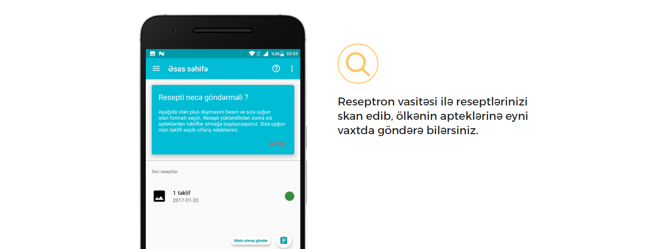 "Reseptron", yerli developer və həkim mütəxəsislərdən təşkil olunmuş komandanın yaratdığı elektron səhiyyə tətbiqetməsidir. Mobil program, "Google Play" və "App Store" mağazalarında pulsuz olaraq mobil telefonlar üçün təqdim olunacaq. Proqram, xəstələrə, sağlamlıqları ilə əlaqədar məlumatları bir başa tibb müəssisələrinə göndərməyə imkan həlldir. Tətbiqin istifadəyə verilməsinin ilkin mərhələsində xəstələr onlara yazılan reseptləri skan edərək ölkənin apteklərinə göndərə biləcəklər. Əvəzində isə təkliflər bir başa onların mobil telefonlarında görsənəcək.Xidmət, istifadəcilərin (həkim və ya xəstə) arzusundan asılı olaraq dərmanları bir başa ünvana çatdırma imkanını da təqdim edəcək. Gələcəkdə bu sistem, mobil telefonu olmayan vətəndaşlar üçün tibb müəssissələrinə və tibb məntəqələrinə də terminallar şəkilində yerləşdiriləcək. Proqram, ilk növbədə tibbi xıdmətə əlçatanlığı aşağı olan dağlıq kənd əhalisi, müharibə zonasında olan əhali üçün və təbii ki, şəhər əhalisi ücün nəzərdə tutulub. Qeyd edək ki, Azərbaycanın kənd rayonlarında apteklərin sayı cox məhduddur. Qiş vaxtlarında əhali lazımi dərman tapmaq ücün onlarla kilometr yolu qət etməli olur.