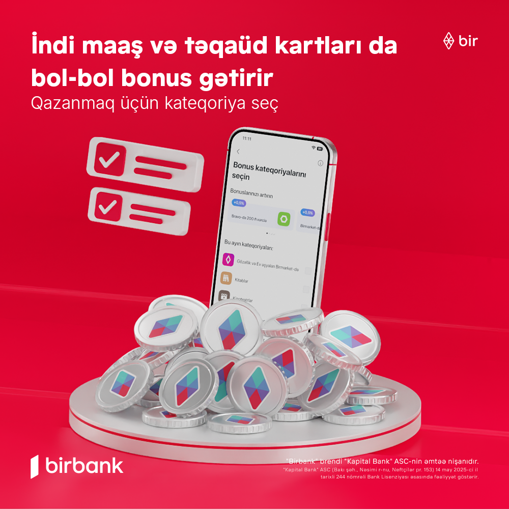 Birbank müştəriləri üçün unikal imkanların əhatəsini genişləndirir. Belə ki, artıq Kapital Bank-a məxsus əməkhaqqı və təqaüd kartları ilə edilən ödənişlər də bonus qazandırır. Bunun üçün Birbank mobil tətbiqində uyğun bonus kateqoriyalarını seçmək yetərlidir. Qeyd edək ki, bonus hər ay mütəmadi olaraq yenilənir və istifadəçilərə 4 fərqli istiqamətdə bonuslar qazanmaq şansı yaradır. Bu kateqoriyalara telefon, internet, kommunal və TV ödənişləri, market, kafe, restoran, taksi, aptek, hotel, YDM və digər xidmətlər daxildir.