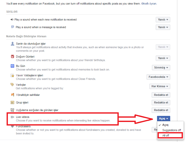 Əgər sizdə canlı yayıml bildirişlərindən bezmisinizsə, "Technote.az" olaraq bundan necə xilas ola biləcəyinizi sizə göstəririk : Bunun üçün "Bu linkə" daxil olaraq, aşağıdakı Live videos - bildirişlərini Açıqdan , Qapalı olaraq dəyişdirməlisiniz.