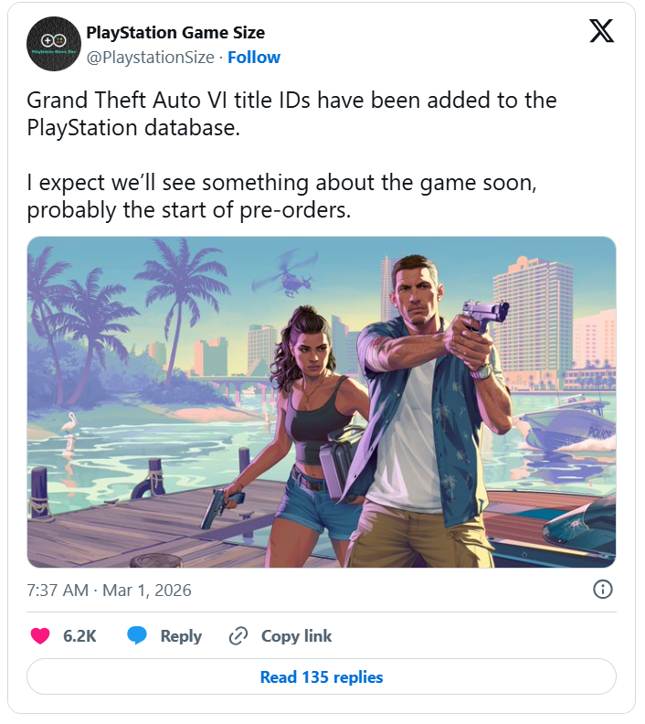 Məlumata görə, “PlayStation Game Size” adlı X hesabı GTA 6 üçün PlayStation məlumat bazasına “title ID”lərin əlavə edildiyini bildirib. Bu isə adətən oyunla bağlı yeniliklərin və ya ön sifariş mərhələsinin yaxınlaşdığına işarə kimi qiymətləndirilir. Sözügedən hesab daha əvvəl də bir çox PlayStation layihələri barədə dəqiq sızıntılar paylaşdığı üçün oyun ictimaiyyəti tərəfindən ciddi qəbul olunur.