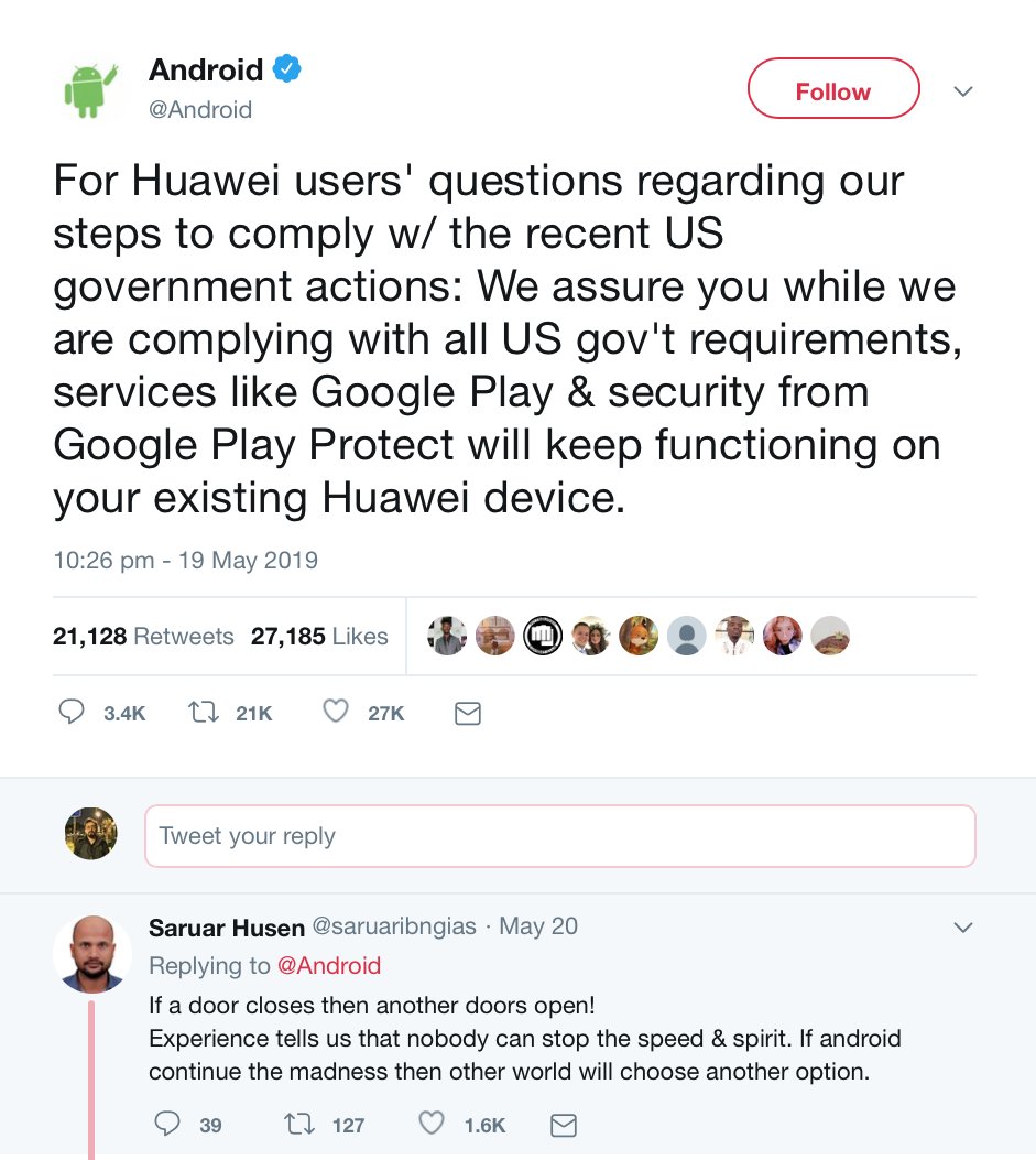 Google-a bir neçə saat ərzində gələn sorğular səbəbindən Android rəsmi Twitter səhifəsindən qoyulan qadağanın məhz yeni Huawei cihazlarına şamil olacağını bildirdi.