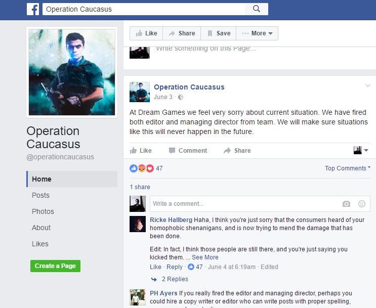 Operation Caucasus - Qafqazda baş verən hadisələri canlandıran bu oyunun başına gəlməyən qalmadı deyə bilərik. "Demo" versiyada "Steam" platformasında təqdim olunan bu oyun, bir müddət sonra həmin platformadan silindi. Pulsuz açar paylanılan zaman LGBT üzvünə açar verməyən və onu təhqir edən komanda üzvləri, baş verəcək bədbəxt hadisələri nəzərə almamışdılar. LGBT üzvünün şikayəti, "Steam" platformasında öz əksini tapdı və dünyanın məşhur oyun mediaları bu biyabırçılıq haqqında yazdılar. Daha sonra demo olmasına baxmayaraq oyun sirli bir şəkildə 1$ qiymətə düşdü, növbəti addımda isə "Steam" üzərindən bu oyun silindi. Bu haqda detallı araşdırmamızı isə bu xəbərimizdən oxuya bilərsiniz. Qeyd edək ki, oyunun rəsmi facebook səhifəsi bu hadisələrdən sonra səhifəsində heç bir paylaşım etməyib və hələ də səssizliklərini qorumaqdadırlar. Yəqin ki, bu layihəni qiymətləndirən expertlərimiz məsələnin bəzi detallarını və risk faktorlarını yaxşı araşdırmayıblar. 15.000 manat dövlət büdcəsinin vəsaiti, Steam-də və qlobal mediada baş verən bir fiasko ilə sonlandı.