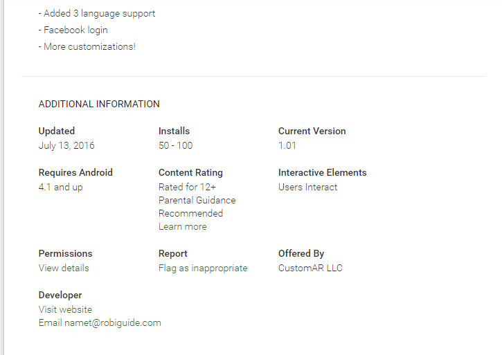 RobiGuide - Şəhərdə olan mərkəzləri, abidələri, mədiyyət evlərini, restoranları və s. obyektləri təyin edən və onlar haqqında yazılı və səsli məlumatlar verən turistlər üçün hazırlanmış tətbiq həllidir. Layihəyə 12.000 manat büdcə ayrılıb. Layihənin rəsmi internet səhifəsinə daxil olduqda, "Coming Soon" bildirişini görə bilərik. Yəni 6 ay keçməsinə baxmayaraq hələ də layihə üzərində işlər gedir. Tətbiq mağazalarından olan "Play Store"dan həmin tətbiqi yükləyib test etmək istədikdə isə qarşımıza bu pəncərə çıxdı və nə edəcəyimizə biz də qərar verə bilmədik.