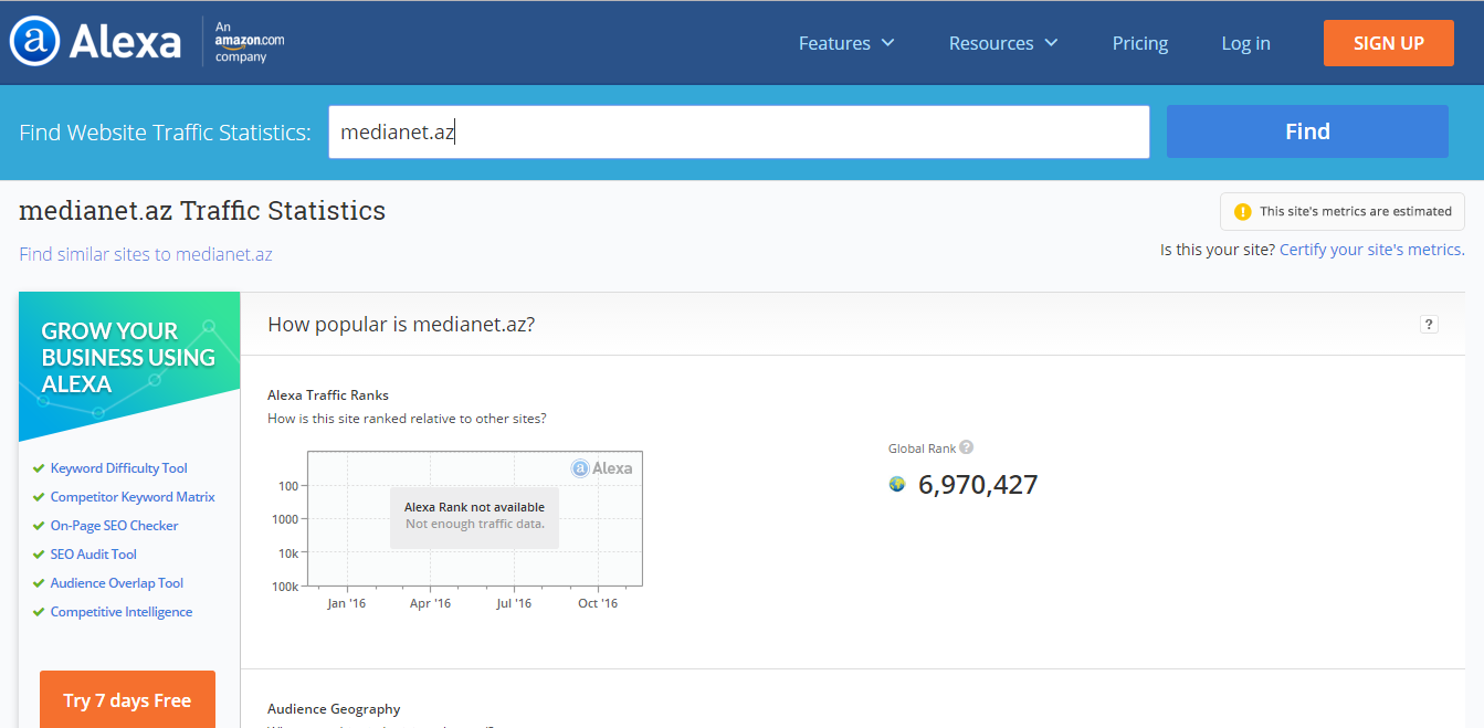 Medianet.az - Media sahəsində press relizlərin göndərilməsi, press relizlərin yayımı və ya xarici dillərə tərcümə olunmasına kömək edən və bu sahədə əlavə xidmətlər verən, media nümayəndələri üçün internet platformasıdır. Sayta nəzər salıb, qeydiyyatdan keçdik. Çox sadə hazırlanan sayt demək olar ki, illərdir tərk edilmiş kimi görünür. Beynəlxalaq statistika saytlarından bəzi statistikalara nəzər saldıq və əlavə şərh vermədən onları sizinlə bölüşmək istəyirik.