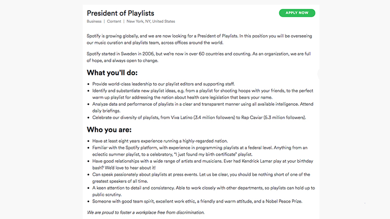 edilir. Hətta bunun üçün iş elanı belə açan Spotify, bu iş elanını görünüşə görə