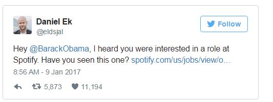 dolayı yoldan Obamanı tərifləyən Spotify-ın bu iş elanı və Daniel Ek tərəfindən