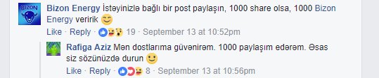 Bizon Energy səhifəsinin də cavabı gecikmədi. Onlar bu qəribə istəyə qeyri-adi qarşılıq verdilər. Belə ki, onlar Rafiga Aziz-un bu postuna 1000 share gələcəyi halda ona nə az, nə çox ,düz 1000 Bizon hədiyyə edəcəklərini bildirdilər.