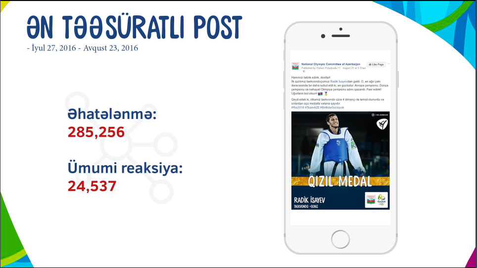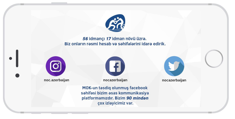 - "National Olympic Committee of Azerbaijan" rəsmi təsdiqlənmiş facebook səhifəsi (93.000+ izləyici). Qeyd edək ki, bu kompaniya çərçivəsində rəsmi facebook səhifəsi orqanik olaraq 30.000 yeni bəyənmə qazandı.