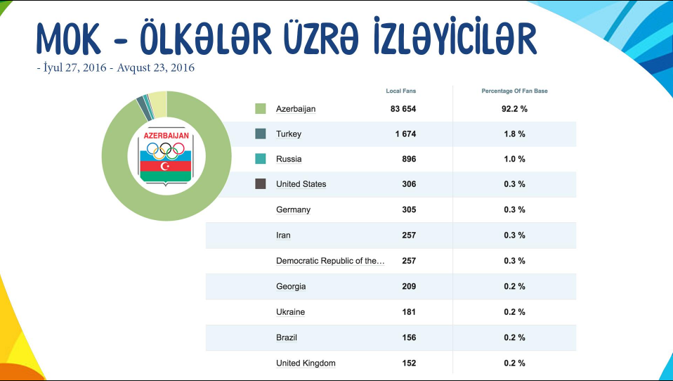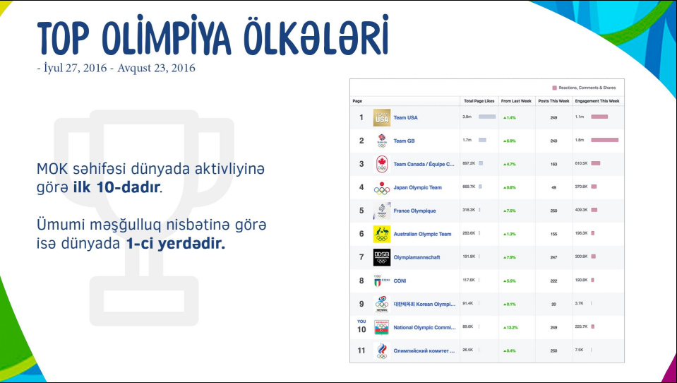 Top olimpiya ölkələri arasında rəsmi səhifəmizin ilk 10-luqda olması və məşğulluq nisbətinə (engagement) görə 1-ci yerdə qərarlaşması bir daha bu səhifə üzərində əmək sərf edən komandanın uğurunu göstərir.