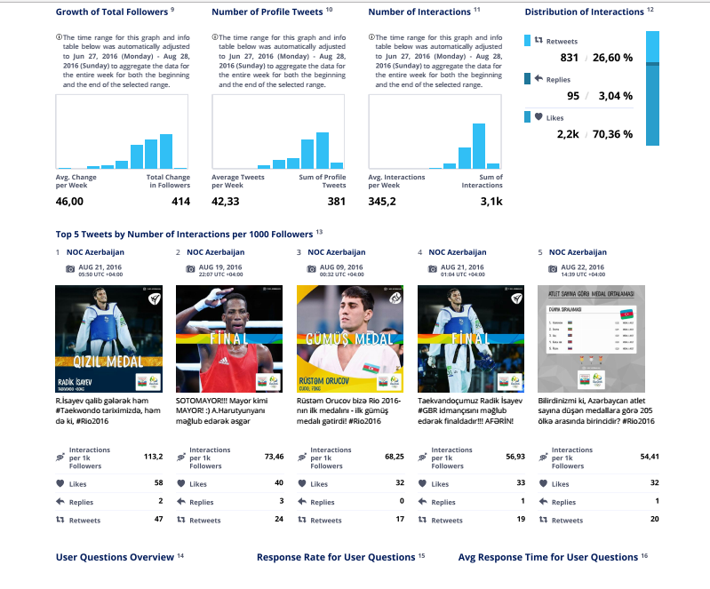 Yuxarıda göstərilən bütün statistika və göstəricilər 1 İyul - 30 Avqust 2016-cı il tarixli "Socialbakers" və "Facebook Insights" məlumatları əsasında hazırlanıb. Bundan əlavə "Socialbakers" statistikalarına görə NOC-un rəsmi Twitter statistikaları aşağıdakı şəkildədir.