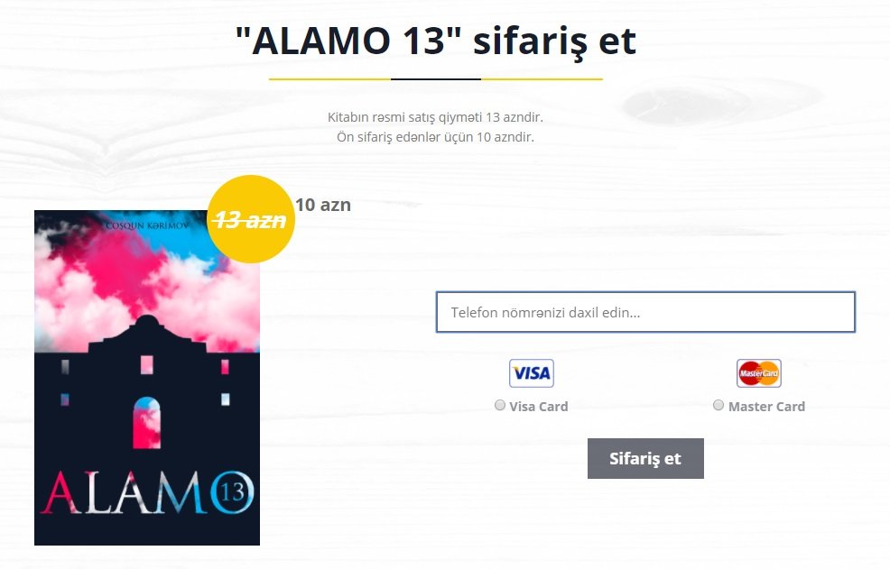 12 Noyabr tarixinə qədər 1000 kitabın ön sifariş edilməsi planlaşdırılıb. Kampaniya 12 oktyabr tarixində start götürüb. Siz də ön sifarişçilərdən olmaq istəyirsinizsə alamo13.com saytından ödəniş etməklə, kitabınızı sifariş edə bilərsiniz. Kitabı sifariş edənlər isə təqdimat gününə dəvət almaq şansı qazanacaq.