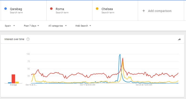 İspaniyanın müxtəlif subregionlarından edilən axtarış nəticələrinə görə 18 Oktyabr tarixində hamının marağını cəlb edən klub Qarabağ FK olub. Burada ən çox oxunan məlumat isə Qarabağ Futbol Klubunun Wikipedia səhifəsində yer alan məlumatları olub. Həmin günə olan digər bir statistikaya görə isə Qarabağ FC, AS Roma və Chelsea klublarını İspaniyadan olan axtarış nəticələrində qabaqlayıb.