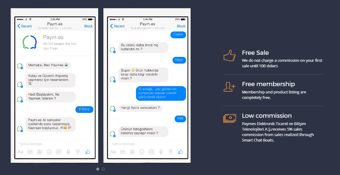 mesajlaşma tətbiqləri üzərindən məhsul alışı ve satışı fürsəti verən "Paym.es", çatbot əsaslı bir e-ticarət və ödəmə sistemi olaraq fəaliyyət göstərir. Hələ ki, 2000 istifadəçi ilə beta versiyada test olunan əlavənin əsas məqsədi elektron ticarəti daha üst səviyyəyə daşımaqdır. Üzvlük və məhsul əlavə etmək xidmətlərini pulsuz olaraq təklif edən tətbiqin əsas biznes modeli hər satışdan 6%-lik kommissiya tutulması əsasında formalaşdırılıb.