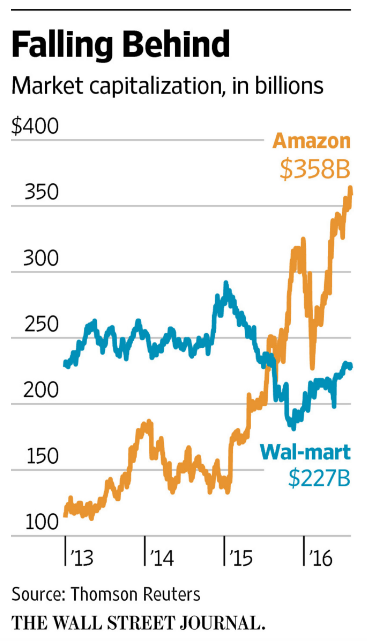 WalMart-ın e-ticarət satışları keçən il 14 milyard dolları keçsə də bu ümumi satışlarının sadəcə 3%-i deməkdir. Sam Walton-un mirasçıları bu gəliri sürətlə artırmaq istəyərkən, Amazon-un keçən ilki gəlirinin 107 milyardı keçdiyini xatırlatmaqda da fayda var.