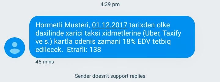 Bugün banklardan müştərilərə göndərilən məlumata əsasən xarici taksi şirkətlərinə plastik kartlar vasitəsilə olunan ödənişlərə 18%-lik əlavə dəyər vergisi tətbiq olunacaq. Yəni, siz Uber, Taxify kimi xidmətlərdən istifadə edən zaman kartla ödəniş etsəniz, sizin balansınızdan 18% əlavə dətəy vergisi də çıxılacaq.