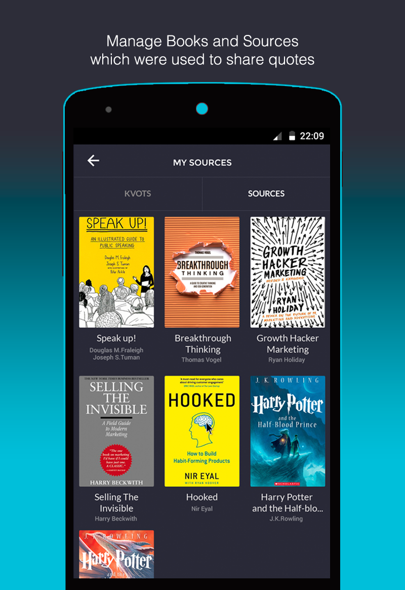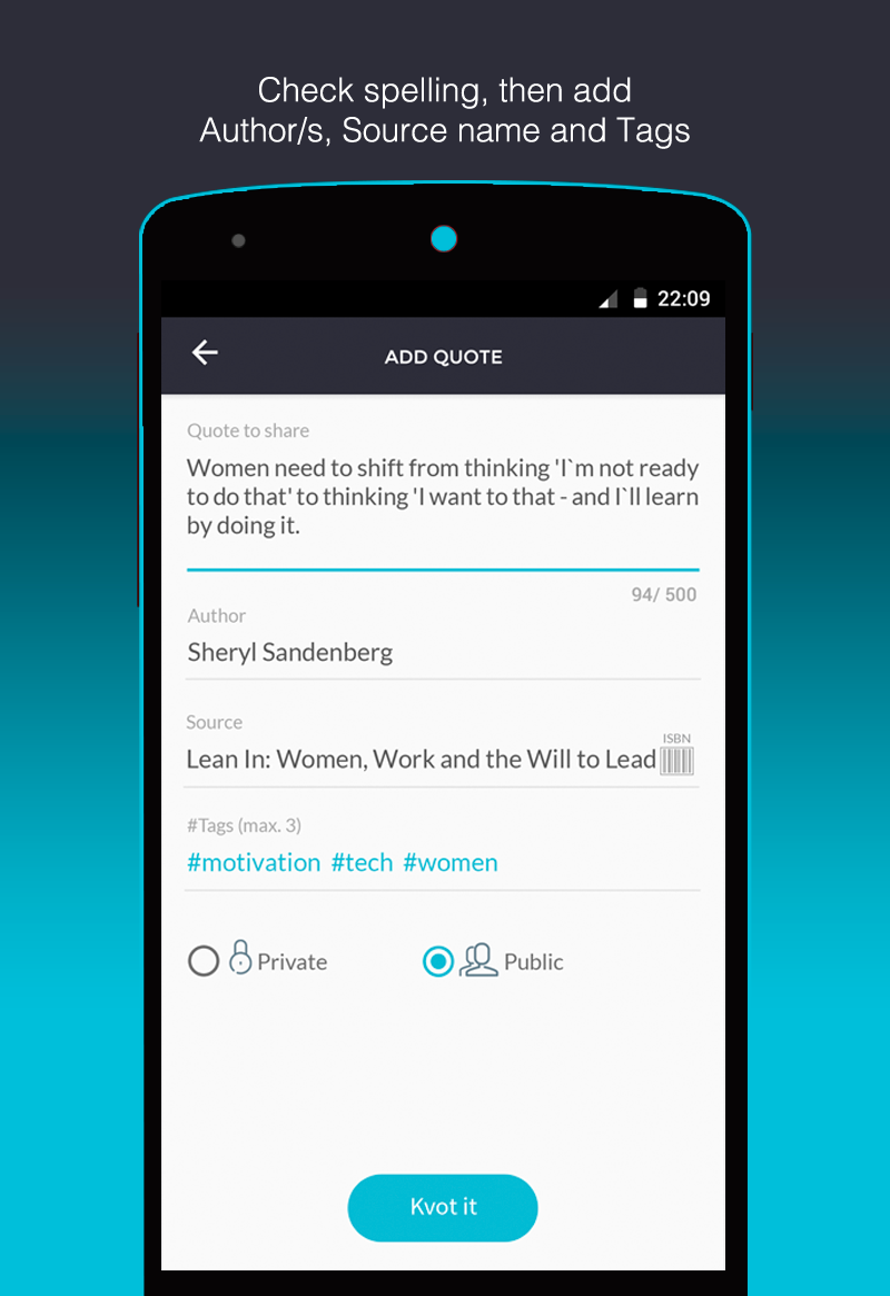 Oxuduğunuz kitablardan bəyəndiyiniz sitatları paylaşmaq üçün nəzərdə tutulmuş Kvotter mobil sosial şəbəkəsinin Android telefonları üçün BETA versiyası istifadəyə verilmişdir. Kvotter-in verdiyi məlumata əsasən, bu mərhələdə istifadəçilərə aşağıdakı əsas funksiyalar təqdim edilib;