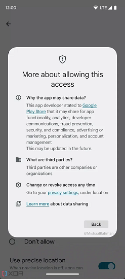Təqdim edilmiş fotolardan da görmək olar ki, Android 14-də reallaşdırılacaq yeni funksiya tətbiqlərə geolokasiya məlumatlarının yığılmasına icazənin verilib-verilməməsi imkanını təqdim edəcək. Bununla yanaşı funksiya yığılan geolokasiya məlumatlarının hansı məqsədlə üçüncü tərəflərə ötürülməsi ilə tanış olmağa şərait yaradacaq. Bundan əlavə olaraq Google ayarlar bölməsinə “Data sharing updates” adlı yeni bölmə əlavə edib. Bu bölmədə son 30 gün ərzində istifadəçi məlumatlarının ötürülməsi ilə bağlı ayarlarında dəyişikliklər etmiş tətbiqlərin siyahısı əks olunacaq. İstifadəçilər isə bu məlumatlarla tanış olaraq öz konfidensiallıqlarının qorunması istiqamətində əlavə tədbirlər görə biləcəklər.