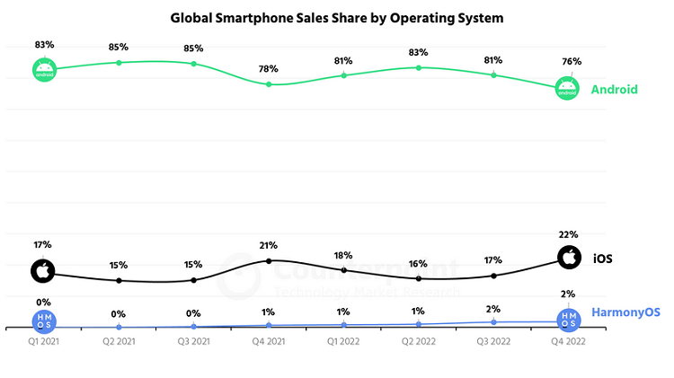 Dünyada olan qəliz vəziyyət səbəbilə 2022-ci ildə giriş və orta seqmentli smartfonlara tələbat artdı. Bunun sayəsində Android əməliyyat sisteminin bazardakı payı 2022-ci ilin əvvəlindəki 78%-dən ilin ikinci rübündə 83%-ə yüksəldi. Eyni müddət ərzində isə iOS-in bazar payı 21%-dən 16%-ə düşdü. Lakin keçən ilin ikinci yarısında vəziyyət dəyişdi. Belə ki, Android-in bazardakı payı 76%-ə düşdü, iOS-in bazardakı payı isə 22%-ə yüksəldi. Mobil əməliyyat sistemləri bazarında Huawei şirkəti də özünün HarmonyOS əməliyyat sistemi vasitəsilə mövqelərini yavaş-yavaş gücləndirir. Son 2 ildə sözügedən əməliyyat sisteminin bazardakı payı sıfırdan 2%-ə yüksəlib. Bununla belə Çin bazarında HarmonyOS bazarın 8%-nə sahibdir.