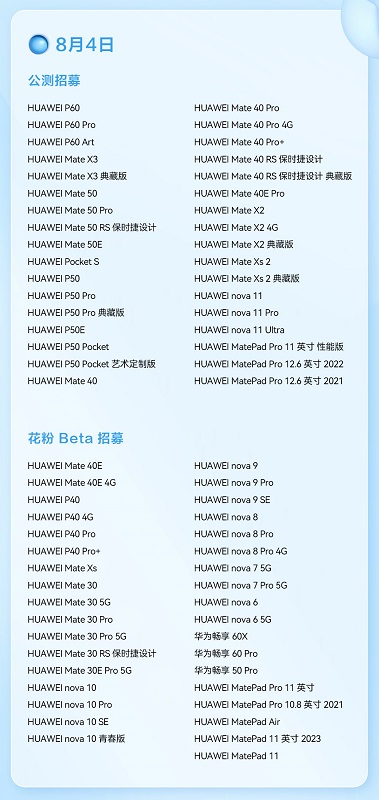 HarmonyOS 4-ün təqdimatından dərhal sonra Huawei şirkəti yeni əməliyyat sisteminin ictimai beta testinə start verildiyini elan etdi. Bununla yanaşı şirkət yeni əməliyyat sisteminin dəstəyini əldə edəcək cihazların siyahısını da təqdim edib və siyahı çox genişdir. HarmonyOS 4-ün ictimai betası 3 qrupa bölünüb. Birinci qrupa smartfon və planşetlərdən ibarət ümumi 34 ədəd cihaz daxil olub. Birinci qrupa daxil olan cihazlar üçün əməliyyat sisteminin beta versiyası bugündən başlayaraq istifadəyə verilir.