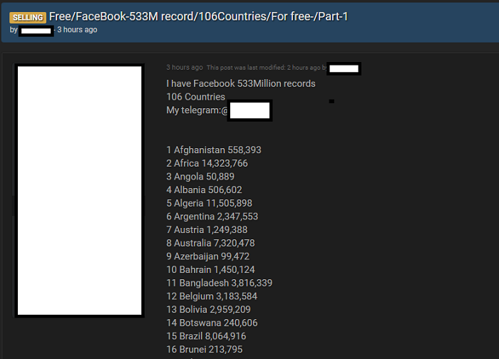 Kibertəhlükəsizlik sahəsində fəaliyyət göstərən Alon Gal adlı tədqiqatçı hacker forumlarından birində istifadəçi məlumatlarından ibarət baza aşkar edib. Həmin bazanı detallı şəkildə analiz edəndən sonra o, 533 milyon Facebook istifadəçisinin məlumatlarının sızdırıldığını təyin edib. Bu barədə Business Insider saytı xəbər verib. Aşkar edilmiş məlumatlar arasında istifadəçilərin telefon nömrələri, doğum tarixləri, elektron poçt ünvanları yerləşdikləri yerlər və s. kimi məlumatlar var. Qeyd etmək lazımdır ki, siyahıda həmçinin azərbaycanlı Facebook istifadəçilərinin məlumatları da yer alıblar. Belə ki, təqdim edilmiş statistikaya əsasən 99.472 nəfər azərbaycanlı Facebook istifadəçisinin məlumatları sızdırılıb.