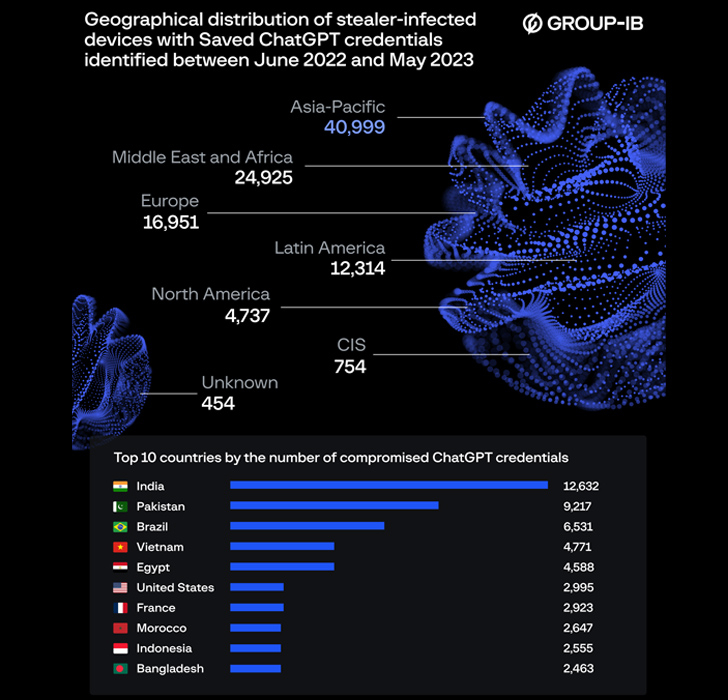 Statistikaya ölkələr üzrə nəzər yetirəndə görmək olar ki, qeyd edilmiş müddət ərzində ChatGPT istifadəçilərinin məlumatları ən çox Hindistan, Pakistan və Braziliyadan sızdırılıb. Bununla yanaşı darknetdə ChatGPT-nin Vyetnam, Misir, ABŞ, Fransa, Mərakeş, İndoneziya və Banqladeşdən olan istifadəçilərin məlumatları da satışa çıxarılıb. Mütəxəssislərin sözlərinə əsasən oğurlanmış məlumatlar arasında istifadəçi hesablarının domenləri və IP ünvanları mövcuddur. Aparılmış tədqiqat çərçivəsində məlum olub ki, məlumatların böyük hissəsi istifadəçilərə Malware as a Service kimi təqdim olunan Raccon adlı zərərli proqram təminatı vasitəsilə oğurlanıb.
