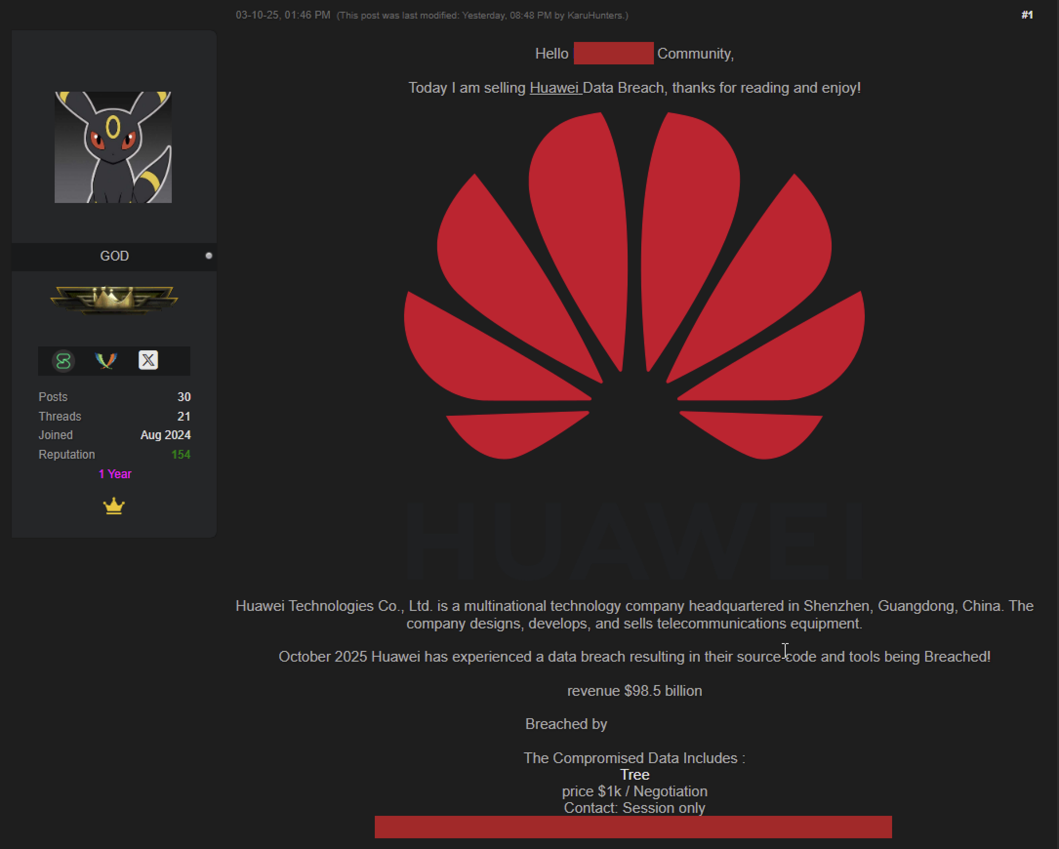 Kibercinayətkarlar Huawei şirkətinin daxili repozitoriyalarını sındırdıqlarını və oradan guya məxfi mənbə kodlarını və tərtibat vasitələrini ələ keçirdiklərini bildiriblər. Sızmanın baş verdiyi hələlik təsdiqlənməyib, lakin hakerlərin iddiaları doğru olarsa, bu, şirkət və onun dünyanın müxtəlif ölkələrindəki müştəriləri üçün ciddi risklər yarada bilər. Sosial şəbəkələrdə və qapalı forumlarda Huawei şirkətinə edilən kiberhücumla bağlı paylaşımlar yayılmağa başlayıb. Hakerlər iddia edirlər ki, onlar şirkətin daxili kod repozitoriyalarına, o cümlədən şəbəkə avadanlıqlarının idarəetmə proqram təminatına, baza stansiyalarının proqram təminatlarına və təhlükəsizlik kitabxanalarına daxil olmağı bacarıblar. Kibertəhlükəsizlik sahəsindəki tədqiqatçılar hazırda bu iddiaların doğruluğunu yoxlamağa çalışırlar, çünki hakerlər öz nüfuzlarını gücləndirmək üçün hadisənin miqyasını saxtalaşdıra və ya şişirdə bilərlər.