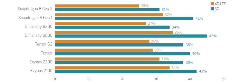Bununla belə smartfonların hansı rejimdə çalışdıqları da nəzərə alınıb. Məlum olub ki, 5G şəbəkələr smartfonun enerji səviyyəsinə ciddi şəkildə təsir göstərirlər. Məsələn Snapdragon 8 Gen 2 prosessoruna sahib smartfonlar 5G şəbəkəsində çalışma rejimində 6%, Tensor G1 və G2 prosessorları vasitəsilə çalışan smartfonlar isə 5G şəbəkəsində çalışma rejimində 11% və 10% daha çox enerji sərf ediblər. G1 və G2 prosessorları ilə çalışan smartfonlar dedikdə isə Pixel 6 və Pixel 7 smartfonları nəzərdə tutulur. Smartfonun bir dəfə şarj olunmasından sonra uzun müddət ərzində çalışmasına nail olmaq istəyən istifadəçilərə 5G-dən 4G-yə keçid etmək məsləhət görülüb.