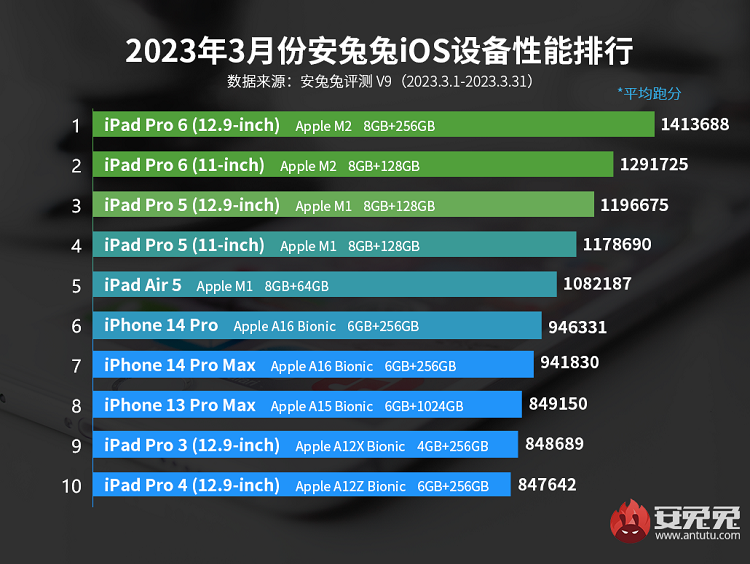 AnTuTu bençmark saytı mart ayı üzrə ən güclü Apple cihazlarının reytinqini təqdim edib. Təqdim edilmiş reytinqə 10 cihaz daxil olub. 10 cihazdan ilk 5-i müxtəlif iPad modellərini əhatə edir. Reytinqin iPhone-lar ilə bağlı hissəsində isə maraqlı bir hal yaşanıb. Belə ki, iPhone 14 Pro Max-ın test nəticələri iPhone 14 Pro-nun test nəticələrindən daha aşağı olub. Nəticədə iPhone 14 Pro modeli iPhone 14 Pro Max-dan bir pillə yuxarıda qərarlaşıb. Beləliklə AnTuTu tərəfindən təqdim edilmiş reytinqin ilk beşliyini iPad planşetləri tutublar.