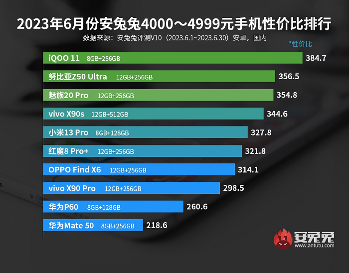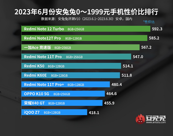 AnTuTu bençmarkı müxtəlif qiymət kateqoriyalarına əsasən qiymət-performans nisbəti üzrə iyun ayının ən yaxşı Android smartfonlarının reytinqlərini təqdim edib. Beləliklə 276$-a kimi olan satış qiymətinə sahib smartfonlar arasında qiymət-performans nisbəti üzrə ən yaxşı Android smartfonlar bunlardır. Redmi Note 12 Turbo, Redmi Note 12T Pro, OnePlus Ace Racing Edition, Redmi Note 11T Pro, Redmi K50, Redmi K60E, Redmi Note 11T Pro+, OPPO K10 5G, Honor X40 GT və iQOO Z7.