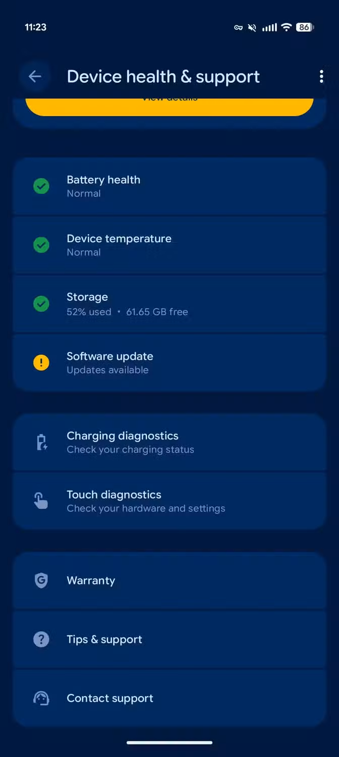 Müasir Pixel modellərindəki Device health & support paneli ilə Pixel 6a modelindəki panel arasında müəyyən fərqlər var.