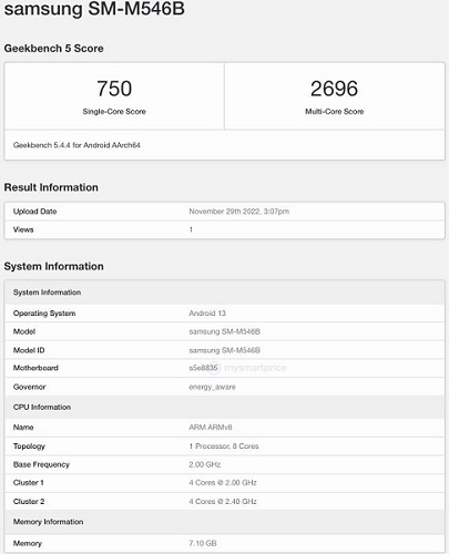 Samsung-un hələ təqdim edilməmiş Galaxy M54 5G smartfonu Geekbench bençmark saytının testlərindən keçib. Smartfon SM-M546B model nömrəsinə sahibdir. Mövcud olan məlumatlara əsasən Galaxy M54 5G smartfonu s5e8835 nömrəsinə sahib prosessor vasitəsilə çalışacaq. Güman olunur ki, söhbət, Exynos 1380 prosessorundan gedir. Halbu ki, bir neçə müddət bundan öncə ortaya çıxmış məlumatda qeyd edilmişdi ki, Galaxy M54 5G Snapdragon 888 prosessorunu əldə edəcək. Bununla yanaşı smartfon 8 GB RAM ilə təchiz olunmalı və Android 13 əməliyyat sistemi vasitəsilə çalışmalıdır.