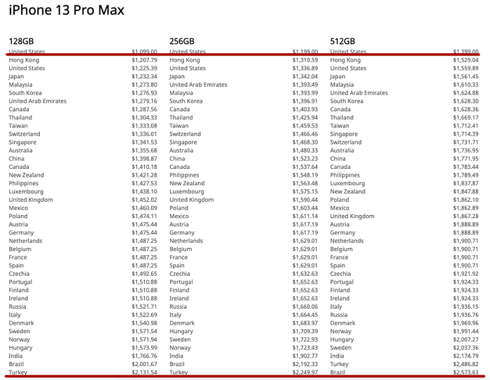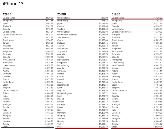 Belə ki, Türkiyədə sözügedən smartfon 1301$-a, Braziliyada isə 1256$-a satılır. Adi iPhone 13 ilə olan vəziyyət iPhone 13 mini ilə demək olar eynidir. 128 GB yaddaşa sahib iPhone 13 modeli ABŞ-da 829$-a, Braziliyada 1446$-a, Türkiyədə isə 1419$-a satılır. Seçilmiş daxili yaddaş həcmindən asılı olaraq iPhone 13 Pro modeli ABŞ-da 999$ və 1099$-a satılır. Braziliyada isə satış qiymətləri 1808$ və 1998$ təşkil edir. iPhone modelləri Avropanın bəzi ölkələrində də baha qiymətə satılır. Məsələn Norveçdə iPhone 13 modeli 1140$-a, iPhone 13 Pro Max modeli isə 1571$-a satılır.
