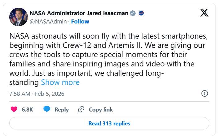 Technote.az “Mashable” platformasına istinadən bildirir ki, NASA tarixində ilk dəfə olaraq astronavtların şəxsi smartfonları, o cümlədən Apple iPhone modellərini kosmosa aparmasına rəsmi icazə verib. Bu qərar artıq yaxın kosmik missiyalarda tətbiq olunacaq.