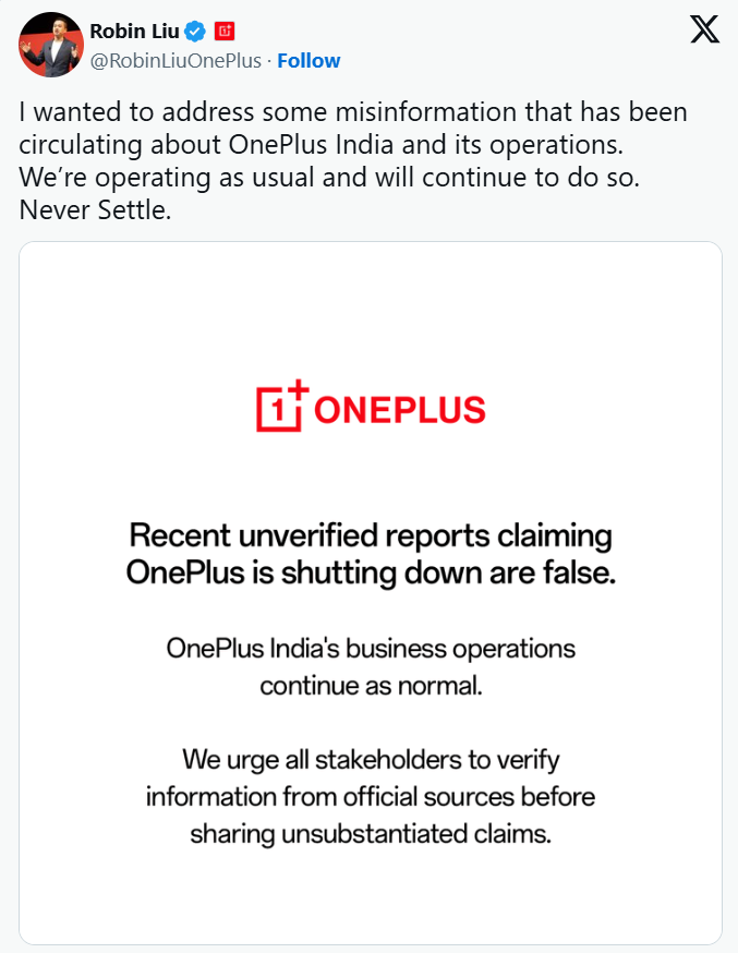 Daha əvvəl Android Authority yazmışdı ki, OnePlus-ın Hindistandakı bölməsi fəaliyyətin adi qaydada davam etdiyini açıqlayıb. OnePlus Hindistanın CEO-su Robin Liu isə X sosial şəbəkəsində paylaşım edərək, yayılan xəbərləri “təsdiqlənməmiş” və “yanlış” adlandırıb, şirkətin normal işlədiyini vurğulayıb.