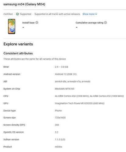 Bir neçə müddət bundan öncə Samsung şirkəti Galaxy A04 və Galaxy A04e smartfonlarını təqdim etmişdi. İndi isə şirkət daha bir büdcəli smartfon üzərində çalışır. Söhbət, Galaxy M04 smartfonundan gedir. Sözügedən smartfon Google Play Console-un məlumatlar bazasında ortaya çıxıb. Məlumata əsasən Galaxy M04 modeli 8 nüvəli MediaTek Helio G35 prosessoru və 3 GB RAM ilə təchiz olunacaq. Bununla yanaşı smartfon HD+ keyfiyyətli ekran, ekran üzərində damcı formalı çıxıntı hissə və yandırıb/söndürmə düyməsinə inteqrasiya edilmiş barmaq izi skanı texnologiyası əldə edəcək. Smartfon Android 12 əməliyyat sistemi vasitəsilə çalışacaq. Gözləntilərə əsasən Galaxy M04 modeli 120$ qiymətində satışa çıxacaq.