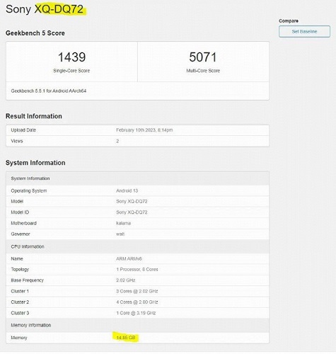 Geekbench bençmark saytının məlumatlar bazasında XQ-DQ72 kod adına sahib cihaz ortaya çıxıb. Söhbət, Sony Xperia 5 V flaqman smartfonundan gedir. Geekbench öz növbəsində sözügedən smartfonun performans göstəricilərindən əlavə olaraq onun bəzi texniki özəlliklərini də ortaya çıxardıb. İlk öncə onu qeyd etmək lazımdır ki, Sony Xperia 5 V Geekbench-in bir nüvəli testi çərçivəsində 1439 xal, çox nüvəli testi çərçivəsində isə 5071 xal toplayıb. Geekbench məlumatlarına əsasən Sony-nin yeni flaqman smartfonu 16 GB RAM ilə təchiz olunacaq. Qeyd etmək lazımdır ki, şirkətin daha əvvəlki flaqman smartfonları maksimum 8/12 GB RAM ilə təchiz olunurdular. Əlavə olaraq Xperia 5 V smartfonu Snapdragon 8 Gen 2 prosessoru vasitəsilə çalışacaq. Yeni flaqman smartfonun gələn həftə Barselonada start götürəcək MWC 2023 sərgisində təqdim ediləcəyi gözlənilir.