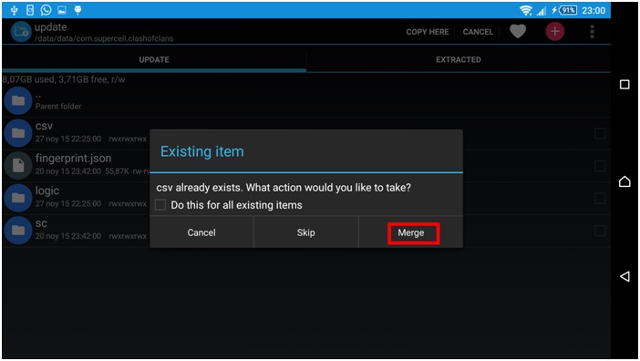 Qarşımıza çıxan pəncərədə Merge yazısına vuruq. Artıq bizim Azərbaycan dilində Clash of Clansımız var və ROOT Explorerdən çıxıb oyunumuza gedib Dil tənzimləmələrindən oyunumuzun dilini dəyişirik