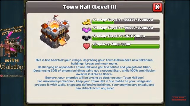 Klan Qalasını ildırım və zəlzələ sehirləri ilə yıxmaq mümkün olacaq. Amma əgər qala tam yıxılmasa orada mövcud olan qəniməti də ala bilməyəcəksiniz. Bu həmçinin TH üçün də keçərlidir. 11.ci səviyyədəki binanın isə resurs saxlamaq qabiliyyəti aşağıdakı şəkildəki kimi olacaq. Amma unutmayın, əgər binanı tam yıxmasanız, həmin resursu ala bilməyəcəksiniz.