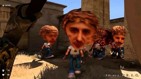 İlk hissədə ki, çöl məbədindən ara küçələrdən qapı olmayan yerdə təkcə yüksək bir yerə çıxıb tullana biləcəyiniz bir şüşə var. Oradan tullanaraq keçsəniz birdən qarşınıza bizim bədən və geyimimizdə amma çox daha böyük başlı canlılar çıxar. Zərər verə bilməzsiniz amma sizə doğru dayanmadan yaxınlaşıb bir şeylər mırıldanırlar atəş edib vursanız qan içində acı bir şəkildə qışqıraraq ölərlər.