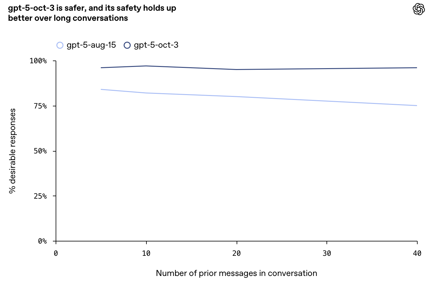 Psixiatrların iştirakı ilə aparılmış testlərin nəticələrinə görə, GPT-5-in yeni versiyası “çətin” söhbətlərdə cavab keyfiyyətində kəskin artım göstərib. Özünə zərərverici davranışla bağlı nümunələrdə model düzgün cavabları 91% hallarda verib (GPT-4o-da bu göstərici 77% idi), ChatGPT-yə emosional asılılıq əlamətləri olan hallarda isə düzgün cavab nisbəti əvvəlki 50%-dən 97%-ə yüksəlib. Mütəxəssislər qeyd ediblər ki, yenilənmiş versiya empatiya ilə real köməyə yönləndirmə arasında tarazlığı daha yaxşı qoruyur. Gələcəkdə OpenAI intihar mövzularına nəzarətlə yanaşı, emosional gərginliyin daha yüngül formalarına da diqqət edən yeni təhlükəsizlik standartlarını tətbiq etməyi planlaşdırır. Şirkət bu mövzuda mütəxəssislərlə əməkdaşlığı davam etdirmək və modellərin davranışını qiymətləndirmək üçün öz metodlarını inkişaf etdirmək niyyətindədir ki, ChatGPT ən həssas söhbətlərdə belə həm faydalı, həm də təhlükəsiz qala bilsin.