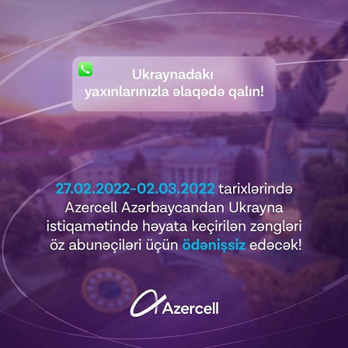 Ukraynada hərbi vəziyyətlə əlaqədar “Azercell Telekom” MMC hazırda orda olan Azərbaycan vətəndaşları, həmçinin vətəndaşlarımızın bu ölkədə yaşayan doğmaları ilə kəsintisiz rabitə əlaqəsini təmin etmək məqsədilə 27 fevral-2 mart 2022-ci il tarixləri arasında Azərbaycandan Ukrayna istiqamətində edilən telefon zənglərini bütün Azercell abunəçiləri üçün ödənişsiz təqdim edəcək.