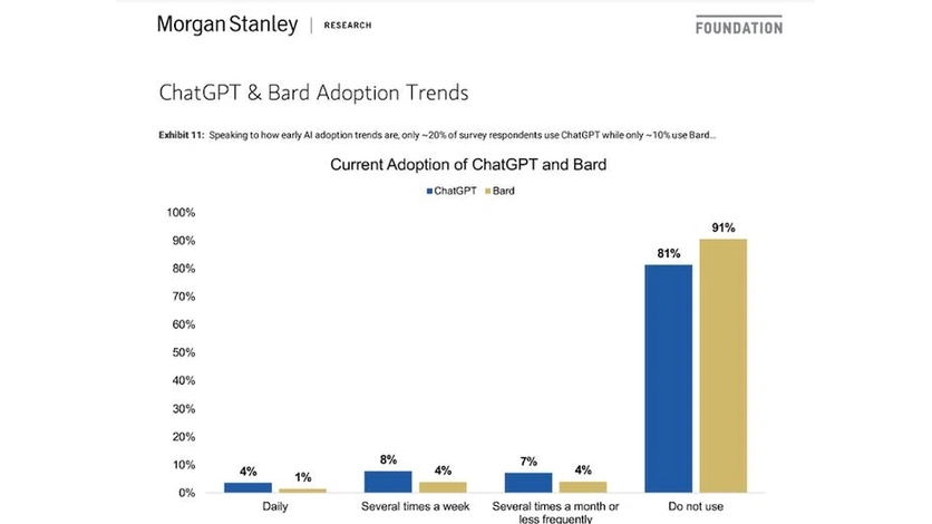 Süni zəka əsaslı ChatGPT çat-botu istifadəyə verilən andan bütün dünyada tez bir zamanda məşhur oldu. Çat-botu yaratmış OpenAI şirkətinin tərtibatçıları isə daimi şəkildə çat-botun üstünlükləri barəsində məlumat verirlər. Nəticədə elə bir hiss yaranır ki, sanki ChatGPT-dən dünyanın bütün insanları istifadə edir. Lakin Morgan Stanley şirkətinin analitiklərinin təqdim etmiş olduqları hesabata əsasən süni zəkanın adi istifadəçilərin həyatlarına təsir göstərməsi fikri olduqca şişirdilib.