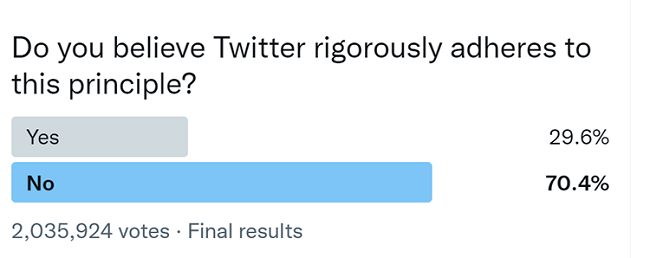 Sorğuda iştirak etmiş istifadəçilərin 70%-i buna inanmadığını qeyd etmişdi. Son zamanlarda Musk Twitter-in siyasətini tənqid edir. Onun fikirlərinə əsasən sosial şəbəkə söz azadlığı prinsiplərinə əməl etməyərək demokratiyanı sarsıdır. Əgər Musk yeni sosial şəbəkənin yaradılması ideyasını həyata keçirtsə, o, söz azadlığı uğrunda mübarizə aparmaqla Facebook, Twitter və Youtube kimi mövcud platformaların yalnız senzura ilə məşğul olduqlarını düşünən istifadəçi kütləsini özünə cəlb etməyə çalışan texnoloji şirkətlərin siyahısına daxil olacaq. Qeyd etmək lazımdır ki, yeni yaradılmış Truth Social, Gettr və Parler kimi sosial şəbəkələrdən heç biri yuxarıda qeyd edilmiş platformalar kimi hələ yüksək istifadəçi kütləsi ilə məşhurluğu əldə etməyib.