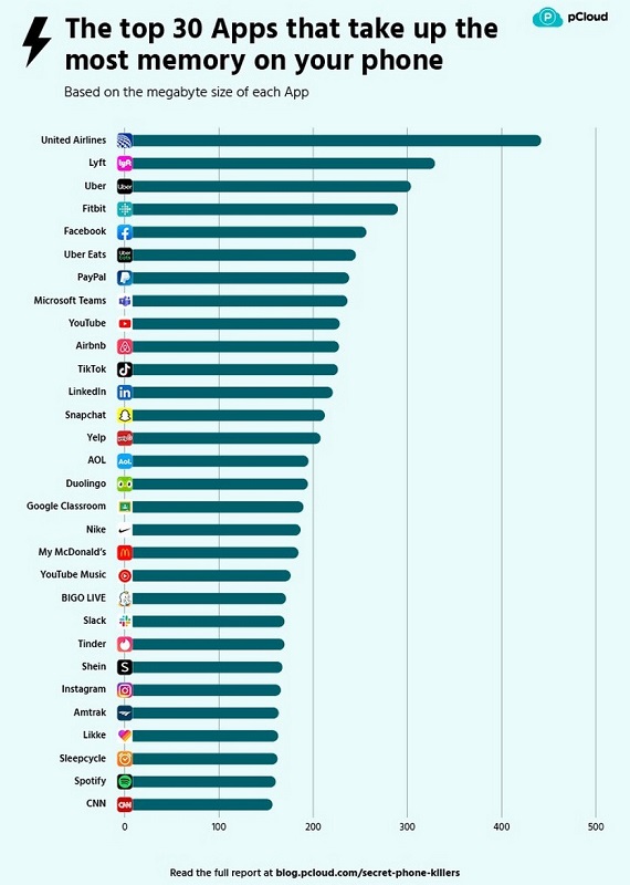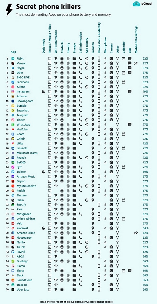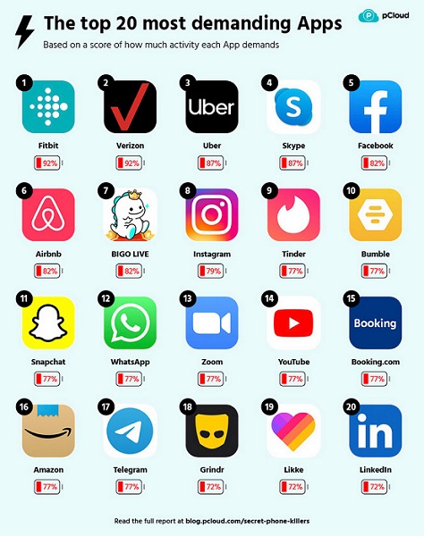 PCloud adlı bulud servisinin tərtibatçıları smartfonda ən çox yeri tutan və ən çox enerji sərfiyyatını reallaşdıran tətbiqlərin reytinqini tərtib ediblər. Sözügedən reytinq yüzlərlə məşhur mobil tətbiqin analizi nəticəsində tərtib olunub. Ən çox resurs sərfiyyatını reallaşdıran tətbiqlərin reytinqlərini tərtib etmək üçün tərtibatçlar 3 faktoru qeydə alıblar: Tətbiqlərin tələb etdikləri konfidensial məlumatlar, enerji sərfiyyatı və tətbiqlərdə Dark Mode rejiminin olub-olmaması. Beləliklə əldə olunmuş məlumatlar əsasında aşkar edilib ki, smartfonların Fitbit fitnes qolbaqları ilə sinxronlaşdırılması üçün nəzərdə tutulmuş eyniadlı tətbiq və Verizon mobil operatorunun mobil tətbiqi digərləri ilə müqayisədə daha çox enerji sərf edir. Bu 2 tətbiqdən hər biri fon rejimində 14-16 ədəd konfidensial məlumatı yığa bilər.