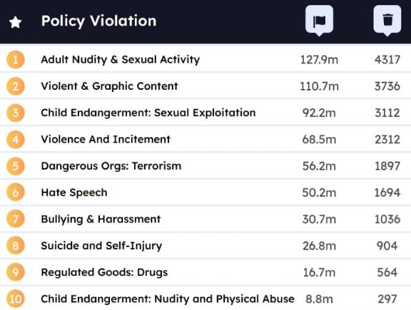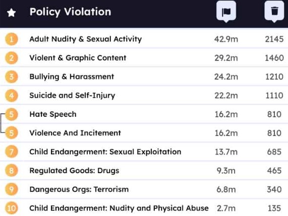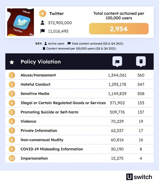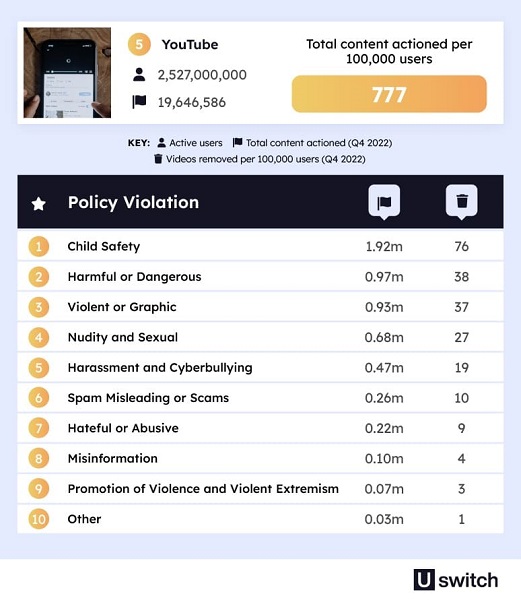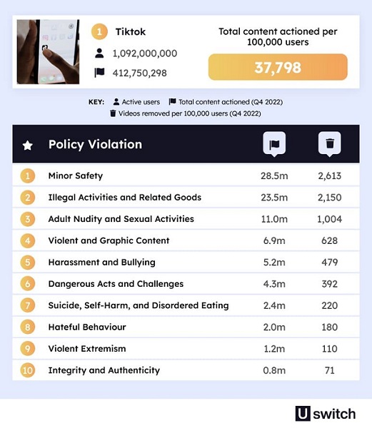 Uswitch adlı saytın analitikləri ən zərərli sosial şəbəkələrin top-5 reytinqini tərtib ediblər və qanunsuz kontentlərin daha çox hansı ölkələrdən paylaşıldığını açıqlayıblar. 2022-ci ildə TikTok moderatorları 412.8 milyon videonu məhdudlaşdırıblar. Bu, hər 100 000 istifadəçinin üzərinə düşən 37 798 ədəd video deməkdir. Bu mövzuda TikTok digər sosial şəbəkələr arasında liderdir. TikTok-da daha çox azyaşlılar üçün zərərli materialları, qanunsuz əməlləri, 18+ materialları, qısnamanı, bullinqi, təhlükəli əməlləri və nifrət xarakterini özündə birləşdirmiş videolar bloklanıb.