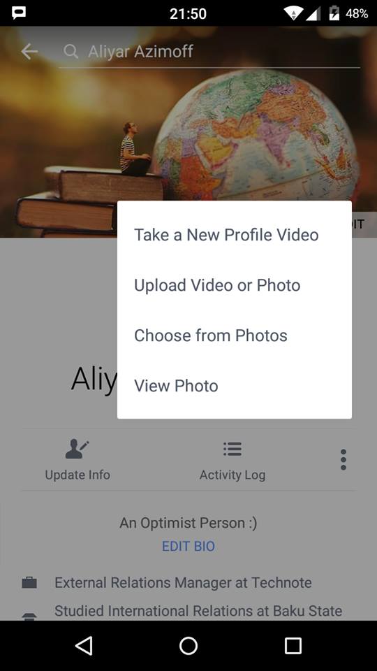 Həmin yazıya tıkladıqda qarşınızda bir menyu açılacaq. İlk seçimdə "Take a New Profile Video" seçimi göstərilib. Bu hissəni seçdikdə telefonun ön kamerası açılır və video çəkib profilə yerləşdirə bilirsiniz. İkinci seçim olaraq isə "Upload Video or Photo" seçimi göstərilib ki, buradan da əvvəlcədən çəkdiyiniz hər hansı bir videonu yükləyə bilərsiniz.