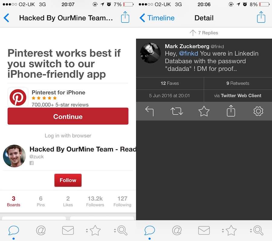 Bazar günü "OurMine" adlı qrup Mark Zuckerberg`in sosial media hesablarını ələ keçirməyi bacardı və onun hesablarından paylaşımlar edərək, Zuckerberg`in istifadə etdiyi şifrəni də qeyd etdilər. Onun rəsmi Twitter hesabını ələ keçirməzdən əvvəl Linkedin hesabını incələyən qrup lazım olan məlumatları ələ keçirdikdən sonra rəsmi hesabları qırmağa başlayıb. Rəsmi hesabları SHA1-password ilə qorunan Zuckerberg, görünür elə də yüksək təhlükəsizlikdən istifadə etmirmiş. Hackerlər onun Linkedin şifrəsinin "dadada" olduğunu açıqladılar və bu şifrəni digərlərində də istifadə etdiyini vurğuladılar.