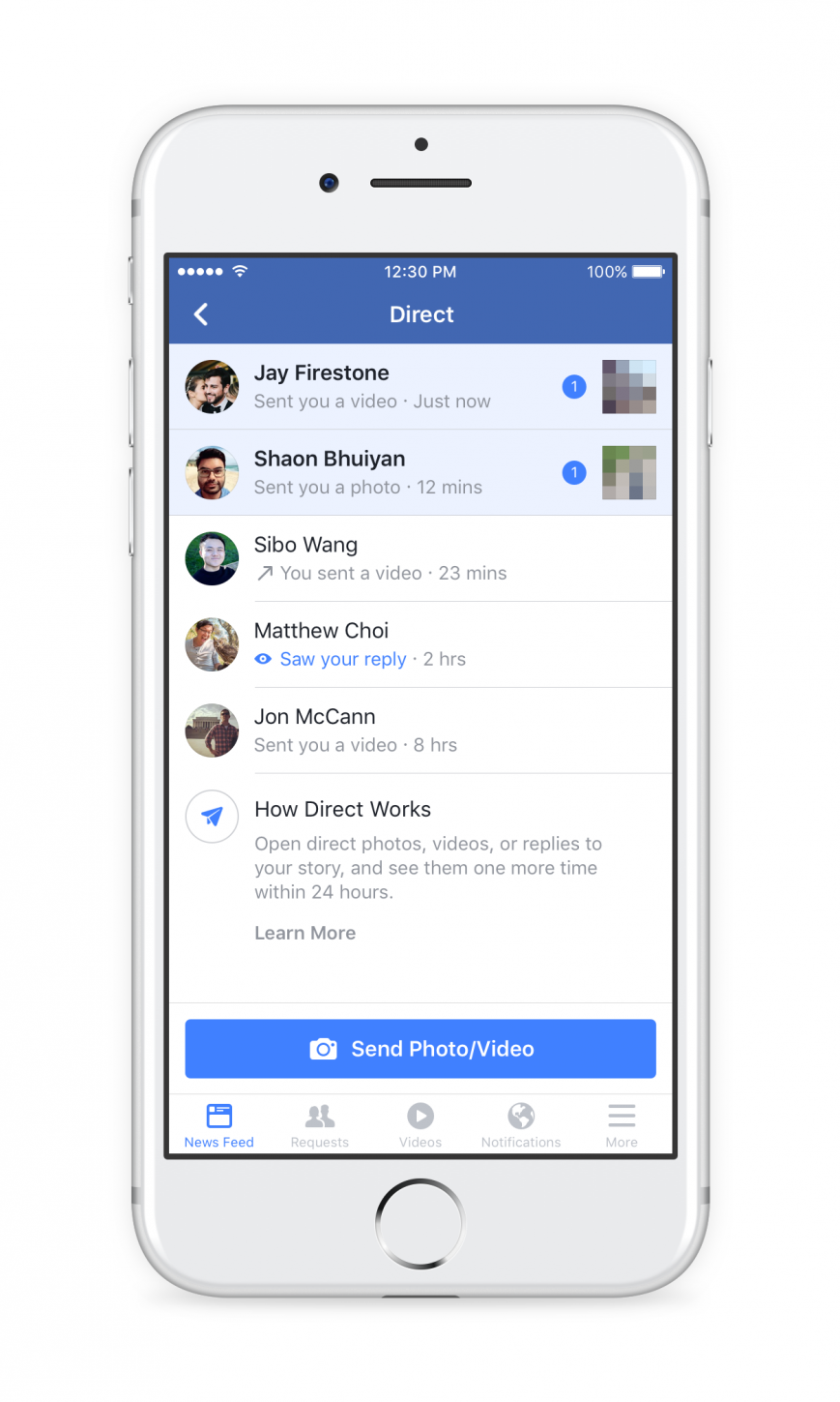 kamera funksiyası, ana səhifənin yuxarı hissəsində yerləşən Stories bölməsi və Direct adlı şəxsi söhbətlər bölməsi. Təkmilləşdirilmiş kamera funksiyası, foto